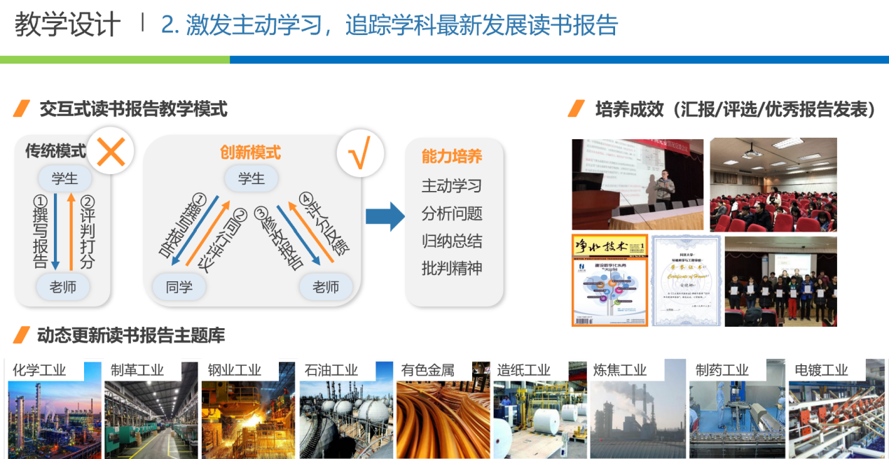 彭开铭老师的参赛课程《工业废水污染防治》是环境工程、给排水科学与工程的主干专业课。工业肩负实现“两个一百年”奋斗目标和“双碳”战略落地的重任。课程通过持续教学改革与实践,践行政治素质与职业素养、专业知识、综合能力“三位一体”的育人理念。具体做法包括:加强思政、科教融合,构建多元化课程体系;接轨行业前沿,打造辩证学习的专题讨论课; 强化主动学习,追踪学科最新发展读书报告;贯穿教学全程,完善学习效果多元评价体系。线上慕课开课以来,除了服务本校学生,还吸引了40余所高校和社会学习者的累计12821人学习;被16 所高校及平台选做SPOC课程资源,教学内容及模式得到相关高校的广泛认可。