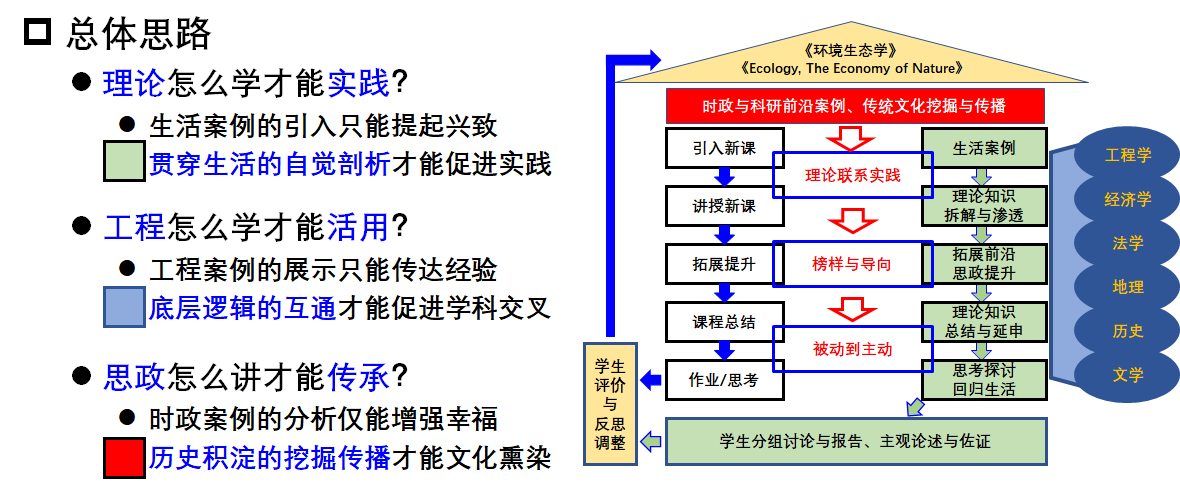 于振洋老师的参赛课程《环境生态学》重点讲授了环境生态学基本原理、群落结构动态变化和演替、物质能量循环流动、生态技术等最新进展。课程设置汉语、英语平行授课制度,课内、课外相结合(1:2)的设计。课内主要讲授课程所涉及的基本知识点,着重对重点和难点进行讲解和讨论。课外让学生自学部分相对简单的课程知识,并完成拓展阅读、作业练习、资料查阅和课程报告等。课程采用多媒体教学手段,实施互动式、研讨式、同伴教学等以学生为中心的学习方式;贯彻了理论实践、工程活用、思政传承的总思路。