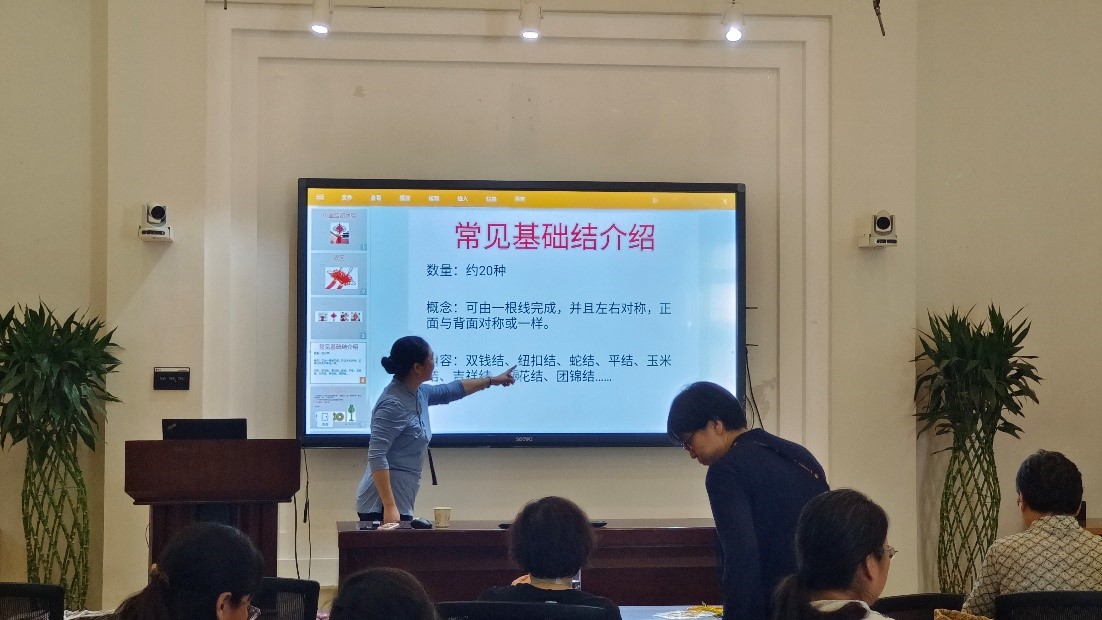 在动手实践环节,褚老师准备了中国结编织方法的教学视频,并对其中几个操作要点示范讲解。教职工动手操作,传艺人在此过程中四处走动,观察并指导每个人的制作。