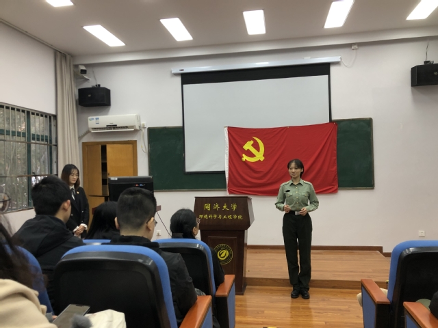 一大会址参观完毕,学生老党员代表王滕同志讲述了自己在酒泉卫星发射中心担任报务员的从军经历。她结合自己的实际经历以及感悟,和大家分享了两句话。一句是中共七大上,毛泽东同志引用的《庄子》中的一句话“其作始也简,其将毕也必巨”。另一句是习近平总书记说的,“入党誓词字数不多,记住并不难,难的是终身坚守”。王滕同志希望可以和所有的党员们一起终身坚守自己“随时准备为党和人民牺牲一切,永不叛党”的誓言。