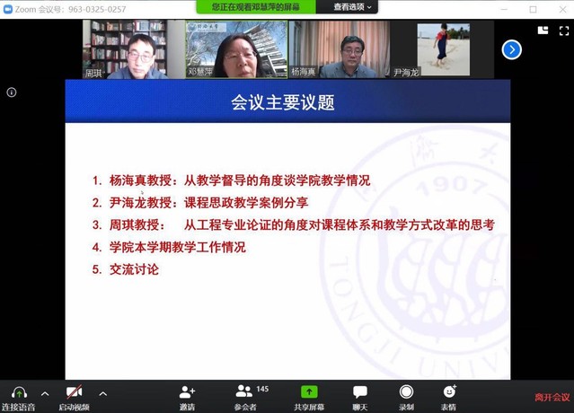 最后,邓院长强调本次会议的主题是聚焦学院教学与人才培养专题,学校非常重视教学和人才培养工作,开学伊始学校多次召开会议强调在防疫期间一定要保证在线教学的顺利进行。她提出了最近一段时间的主要工作任务,第一,做好新生院学生专业确认工作,加强专业课程建设和教材建设,重构工程类专业学位教育体系,有计划申报第二批双万计划、网络公共平台课程、校级金课建设和网络特色精品课程。第二,本研一体化构建同济特色的人才培养教育体系,结合学校的强基计划开展招生预选报工作。最后本次全院大会在热烈的讨论气氛中顺利结束。