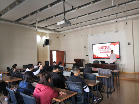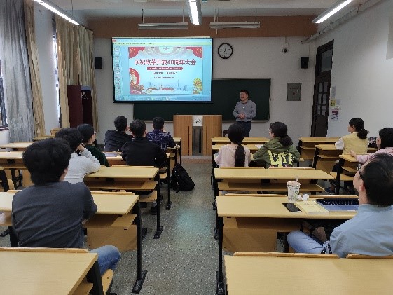 研究生第五支部书记徐斌老师在南楼215教室就“新中国成立七十周年庆主题学习”给第五支部全体同学上了一堂生动的党课。在党课上,徐斌老师结合自己学习工作历程和生活体验,对改革开放以来中国取得的成就和自身感受,与同学们进行了充分的分享与交流。徐斌老师还结合实际经济数据和改革开放过程中的突出人物事迹,进行了生动细致的党课党识讲演。支部同学们无不感受到改革开放取得的进步,让中国社会实现了由封闭、贫穷、落后和缺乏生机到开放、富强、文明和充满活力的历史巨变。