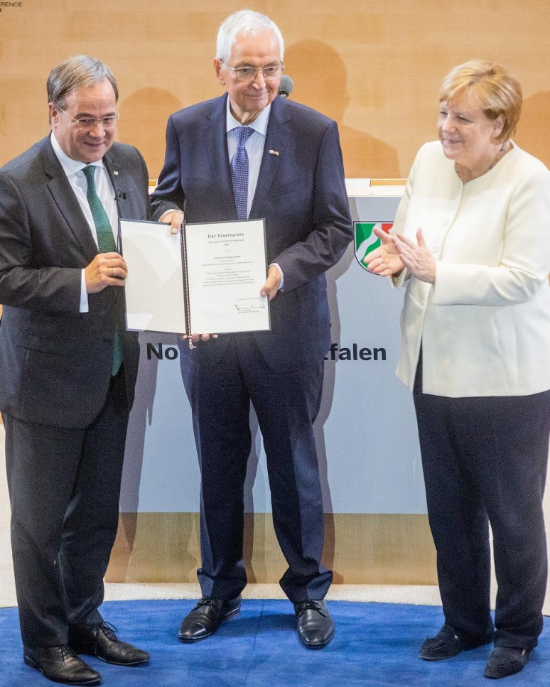 bat365官网登录入口荣誉教授、前联合国副秘书长、联合国环境署执行主任克劳斯9月16日在波恩荣获德国最高奖——北莱茵-威斯特法伦州奖,德国总理默克尔出席并为托普弗博士颁奖。