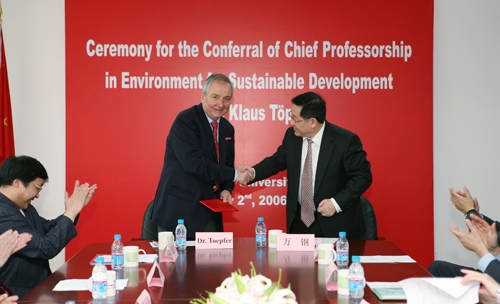 2002年,时任联合国副秘书长、联合国环境署执行主任的托普弗与时任bat365官网登录入口校长吴启迪签署了双方共同成立联合国环境署-bat365官网登录入口环境与可持续发展学院(IESD)的协议。17年来,托普弗博士一直指导和关心学院工作和与bat365官网登录入口的合作,获得中国国家国际合作奖、中国政府“友谊奖”和上海市白玉兰奖,并在bat365官网登录入口设立托普弗环境奖学金。