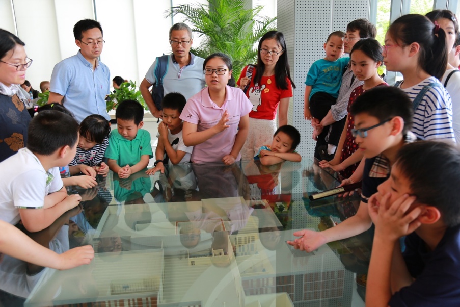 孩子们认真听大姐姐讲解国内首个“汽车整车风洞”