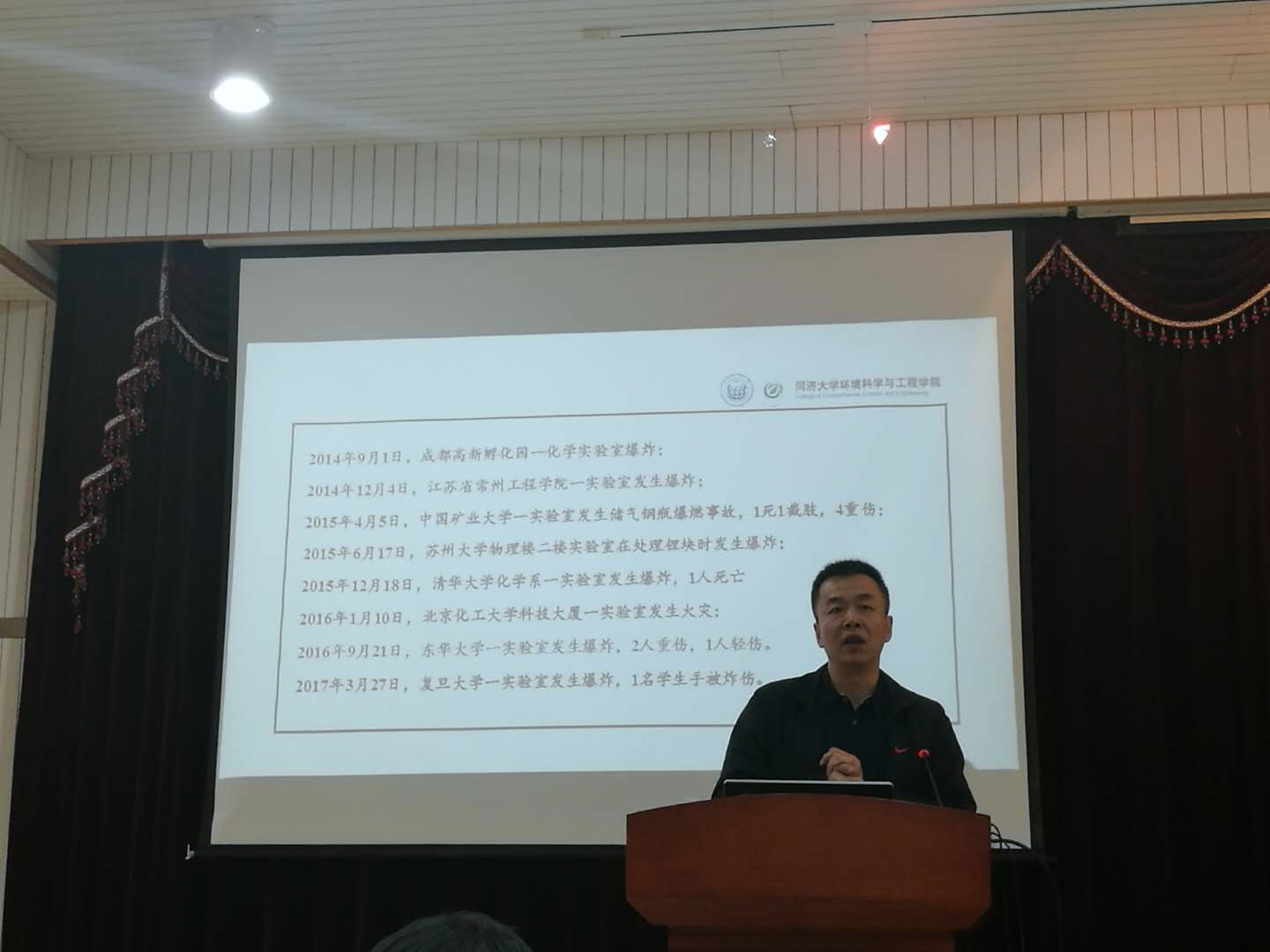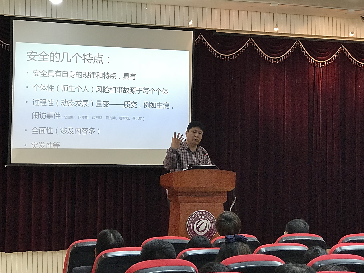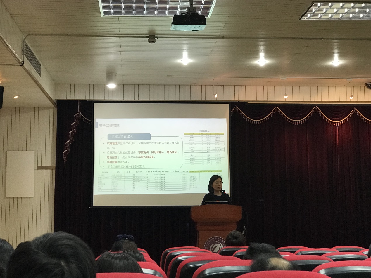 校保卫处副处长刘灿阳老师以国家政策、近年来发生的特大安全事故为切入点、探讨安全生产的意义,并结合我校安全生产现状及国外实验室管理情况对我院的安全生产工作提出了几点具有实效性的建议。针对安全压力逐级递减的情形,他提出希望老师们能清醒认识到安全的重要性,并以“四个全覆盖”为标准推进实验室安全改造及常态管理,争取做到清洁卫生全覆盖、安全检查全覆盖、安全教育全覆盖、安全防护全覆盖。在发言的最后,刘老师勉励在座的各位老师“安全只有起点,没有终点,安全永远在路上”。刘老师生动的演讲引起台下阵阵掌声。