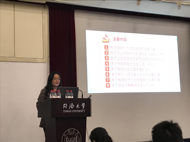 首先薛念文老师深刻分析了十九大报告的内容,对报告的题目和主题进行了详细讲解,深入浅出地对党的十九大提出的新思想、新论断、新要求、新任务作了全面系统而又突出重点的解读,指出过去五年中国进行了深层次、根本性的变革,取得了全方位、开创性的成就,并结合具体事例,表示习近平新时代中国特色社会主义思想是中国共产党在新的历史时期最大的理论成果,适应了中国社会主要矛盾变化的需要,适合中国国情,必将成为中国社会在未来更长时间内我们坚定不移的指导思想和行动指南。希望各位同学们要牢记使命和责任,投身改革,锐意进取,为中华民族伟大复兴的目标不断奋斗。