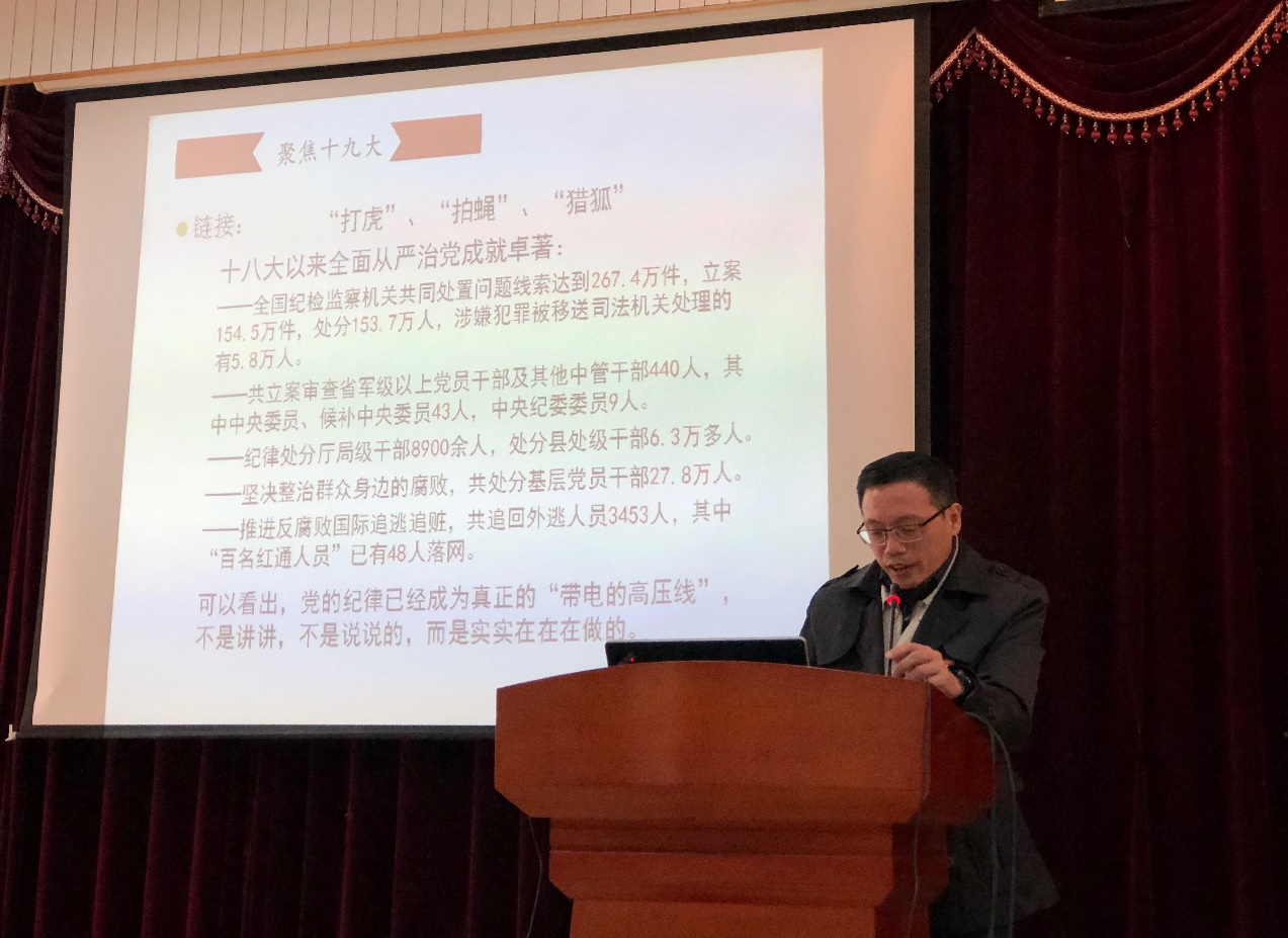 柳剑雄书记聚焦十九大报告中关于党的建设部分,简要介绍了我党自十八大以来全面从严治党所取得的成就,用详实的数据说明了党中央“老虎苍蝇一起打” 、坚决贯彻从严治党要求的决心。柳剑雄书记指出,在新时代党的建设中,要把制度建设贯穿其中,党的工作要深入学院的学术工作开展,深入学生的立德树人培养。