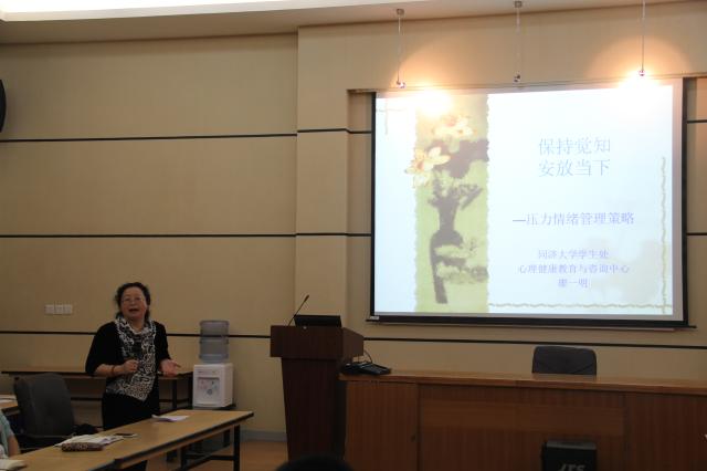 10月19日下午,由bat365官网登录入口研究生会联合14级博士班开展的博士生心理座谈在明净楼四楼学术报告厅成功举办。本次活动邀请了bat365官网登录入口学生处、心理健康教育与咨询中心的廖一明老师, 就自己多年从事心理教育咨询工作给大家作了主题为“压力情绪管理策略之一:保持觉知,安放当下”的主题讲座。学院党委副书记钱昕,14级博士班班主任徐冉,学院研会指导教师、辅导员刘一呈和各年级博士生、部分硕士研究生同学参加了心理座谈活动。
