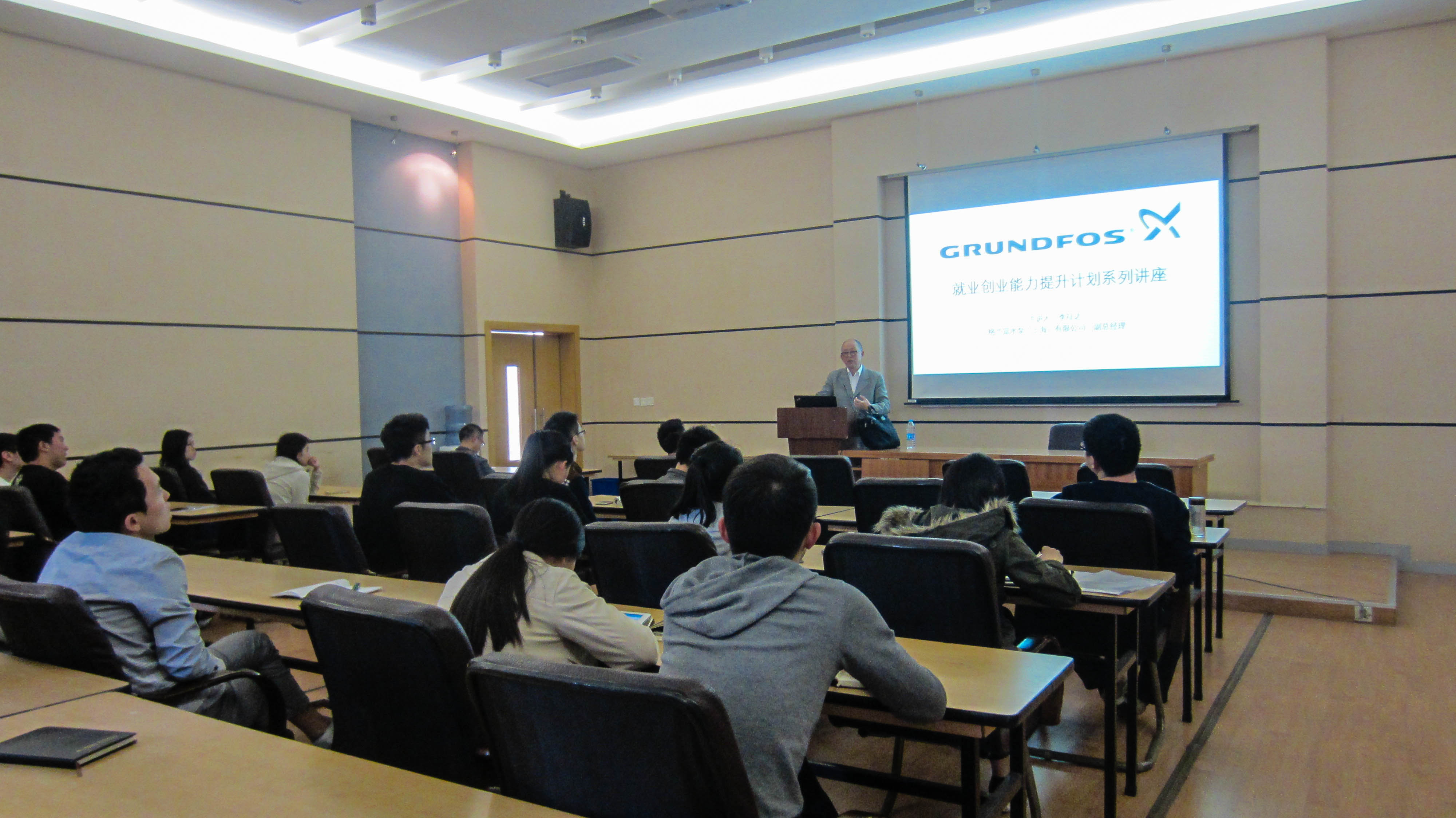 四月两场讲座的主讲嘉宾分别为上海泓济环保工程有限公司宋红坤董事副总经理、格兰富水泵(上海)有限公司李征达副总经理。一个来自“国产”专注环保领域的高科技公司,一个来自来自丹麦的全球泵业领导者之一,两位皆拥有多年人力资源管理经验的资深前辈从不同的角度为同学们讲述了一个有异曲同工之妙的主题,即“新形势下环境人的新选择”。