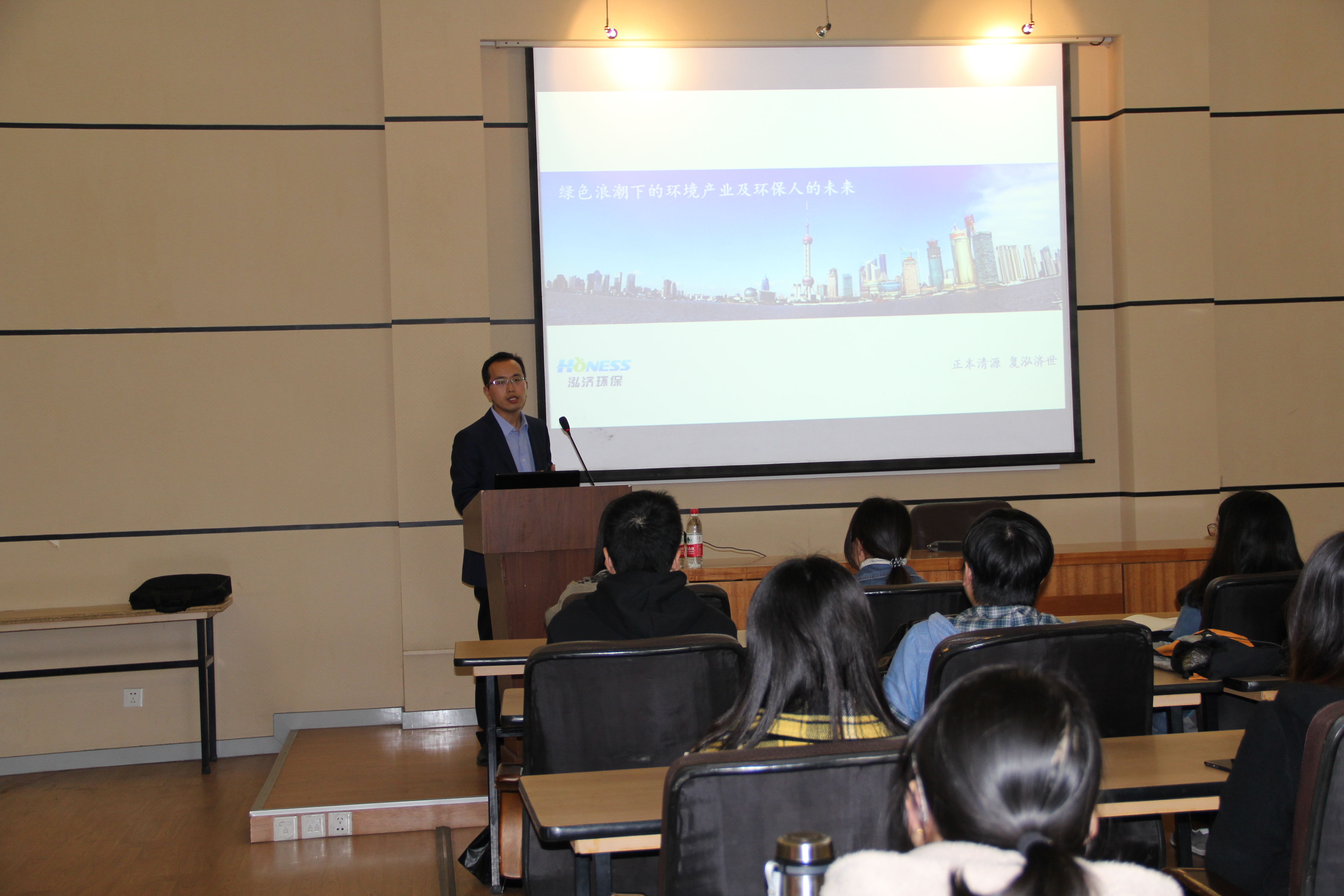 泓济环保的宋总直接将自己的分享题目定为“绿色浪潮下的环境产业及环保人的未来”,他说,随着环保产业阶段的代际演进,环境人所承担的责任与工作也相应的丰富起来,环境产业早已不局限于一个单独的指向,而是将环境技术、环境工程、环境运营与互联网、金融、公益等等叠加起来,生化出了无限多种的可能性。将来的产业发展无疑是多元的、多维的,有志于环境事业的同学们都应当去思索,5年、10年后的行业是什么样的,5年、10年后的自己又在这个行业里扮演着怎样的角色,为了5年、10年后的这个角色现在又应当有怎样的行动。