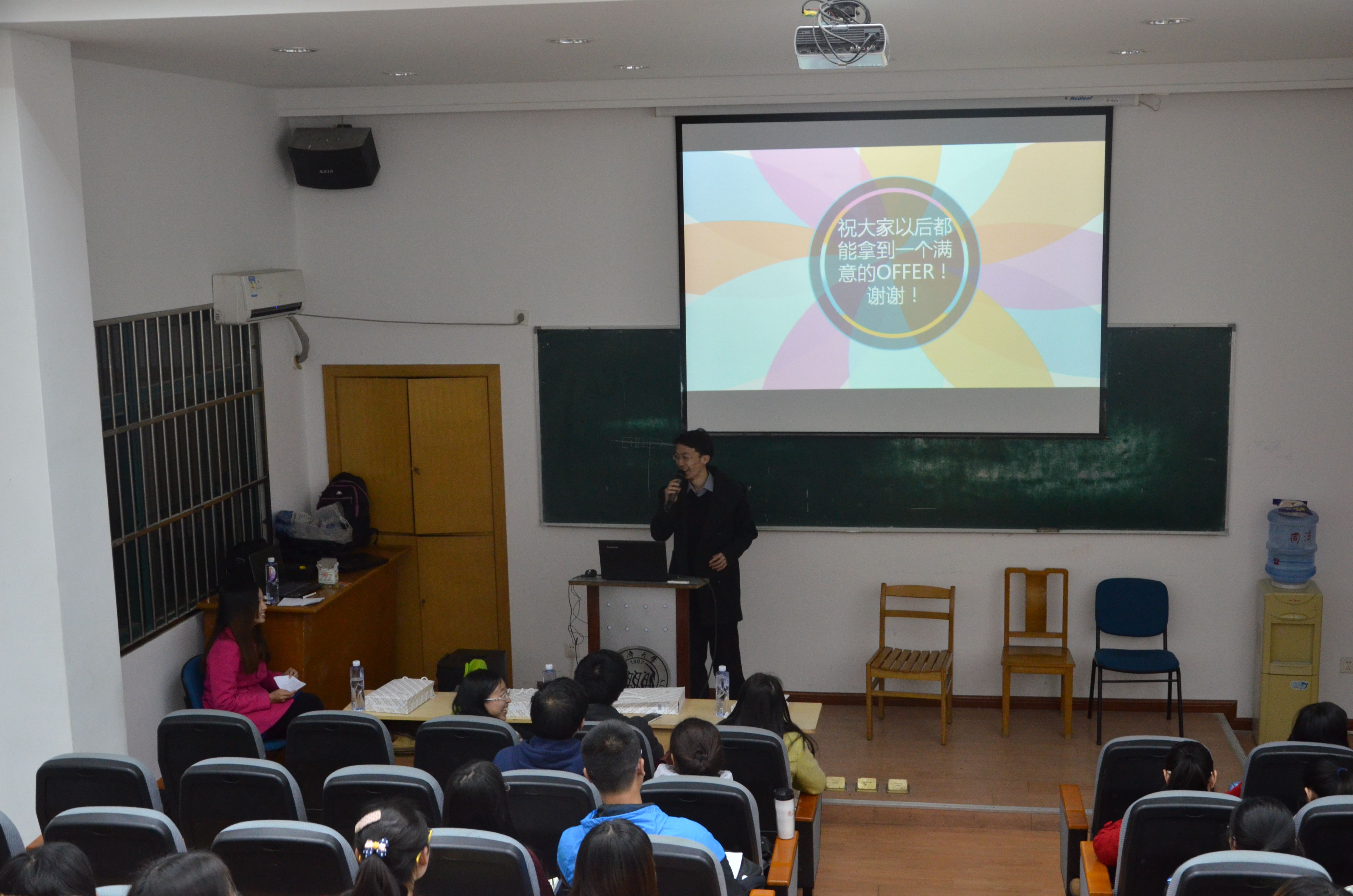 交流会中,阮燕霞向同学们讲述了自己的实习及求职经历,强调找工作前一定要对自身的优势及未来发展目标有深刻认知,切不可骄躁盲目,这样才能真正帮助择业。廖元琨则主要介绍了与环境专业相关的工作类别,并着重介绍了环评行业的相关知识,分析了找工作过程中的时间安排、简历制作、实习选择等,他认为找工作一定要目标明确,有的放矢,切忌盲目海投。此外,他还针对ppt的制作技巧给了许多中肯建议,并强调在工作环境中具备公众演讲能力的重要性。第三位上台分享的是杜嘉丹,她以找工作的亲身经历解答了在场女生最为关心的话题——“找工作是否真的有性别歧视”,她还指出在研究生期间认真做好科研的重要性,用人单位在很大程度上会以一个毕业生的科研能力作为学习能力强弱的评判标准。最后上台的是共拿到12份金融企业offer的赵子威,脱离了PPT,他以即兴演讲的方式介绍了自己为什么转行以及在面试过程中遇到的一些有趣经历。他认为,在平时的学习、生活中多结交优秀的朋友是帮助自己拓宽人脉、发展兴趣的重要途径,这也会助于建立适合自己的就业观。赵师兄的演讲方式幽默诙谐,不时引发会场阵阵笑声,也令大家对求职有了新的视野和认知。