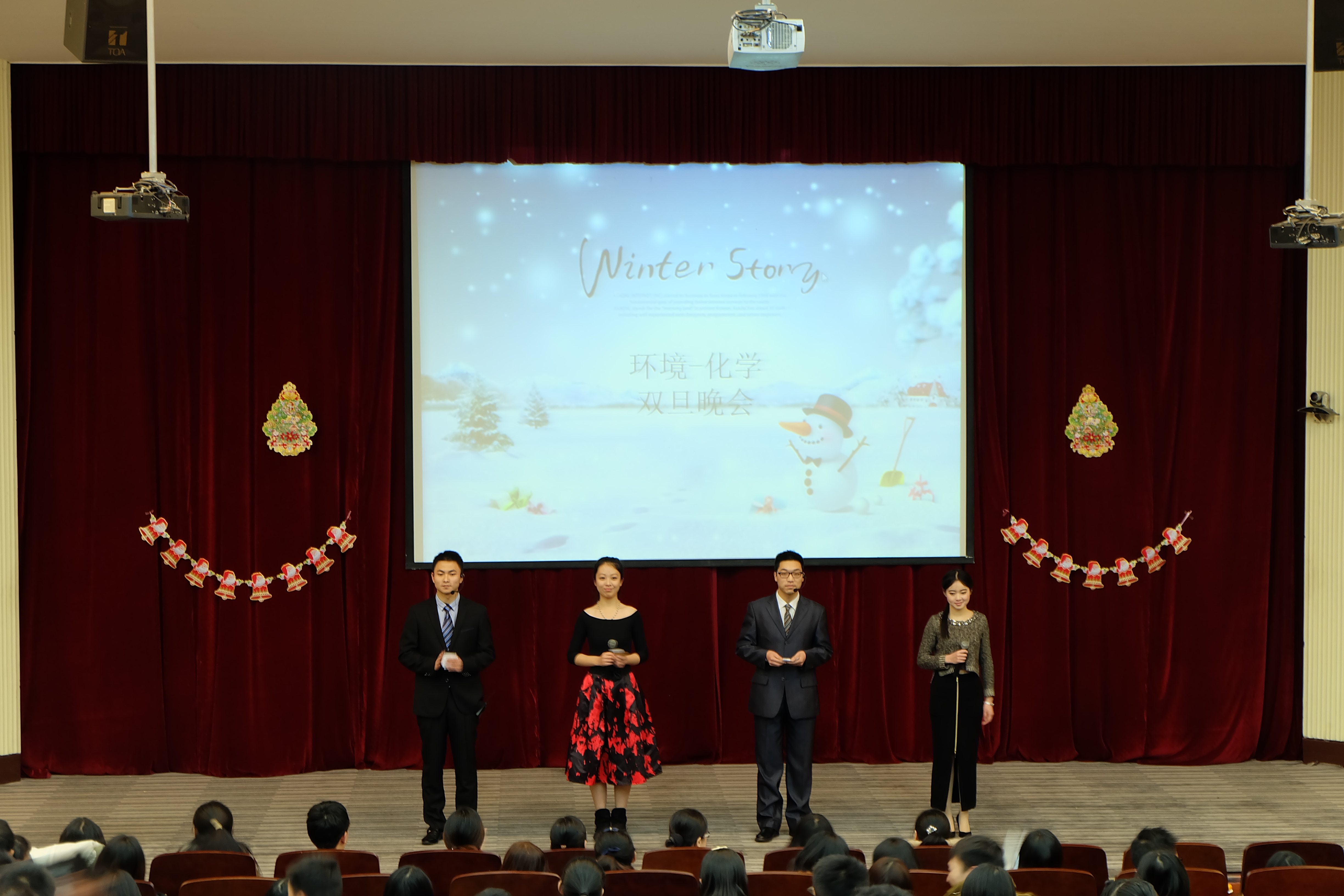 2014年12月20日晚六点半,由bat365官网登录入口和化学系联合主办的“环境-化学研究生双蛋晚会”在逸夫楼一楼报告厅火热上演。bat365官网登录入口党委副书记钱昕老师、化学系党委副书记相波老师共同出席了本次晚会并发表致辞,我院学工办陆丽君老师、各班班主任以及两个学院三百余位同学欢聚一堂,共同庆祝即将到来的圣诞与元旦节日。