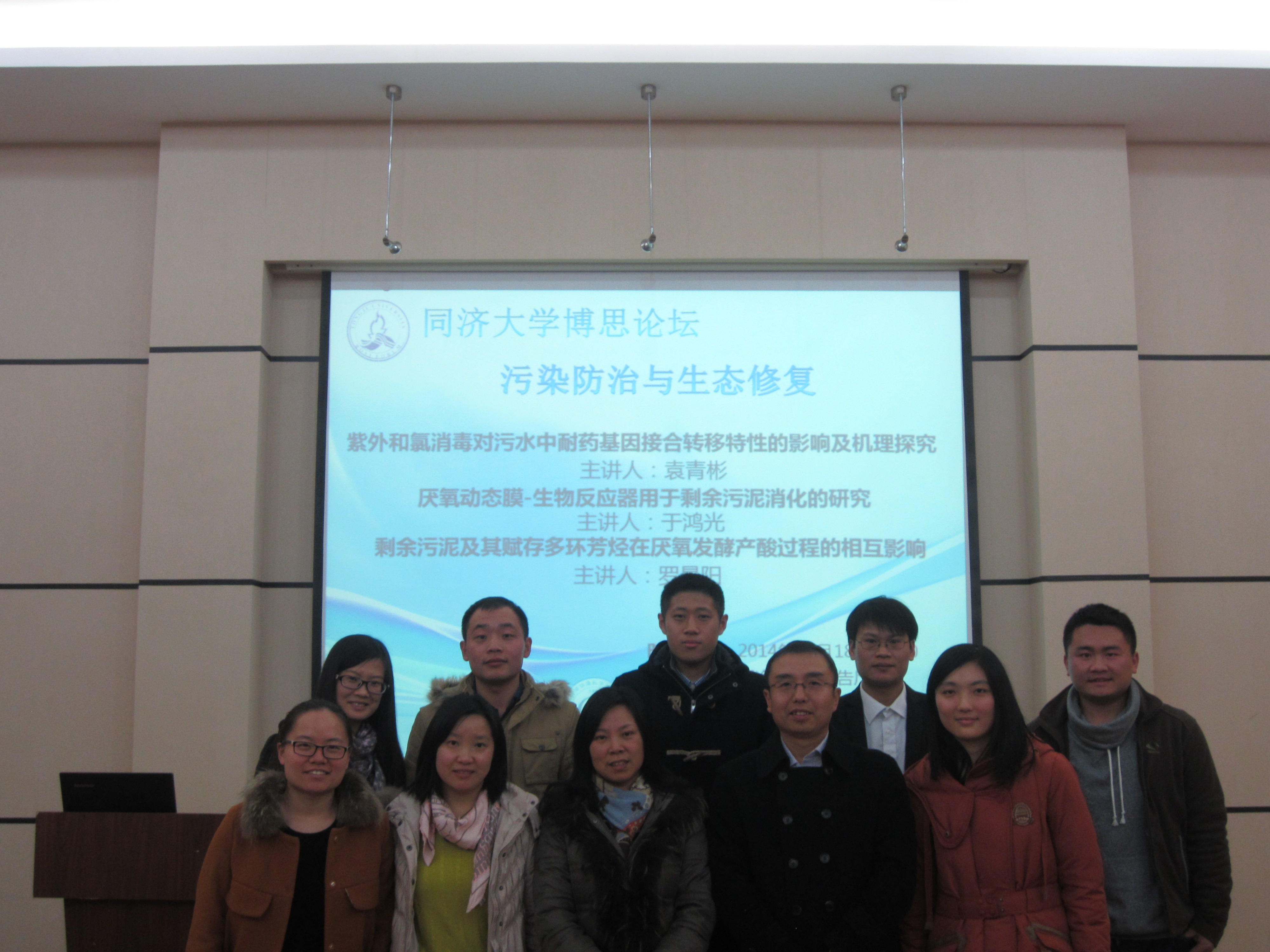 2014年12月18日下午,bat365官网登录入口“博思论坛”bat365官网登录入口分论坛在bat365官网登录入口明净楼4楼报告厅成功举办。本次分论坛的主题为“污染防治与生态修复”,邀请到了bat365官网登录入口的李咏梅教授、王荣昌副教授以及谢丽副教授作为点评嘉宾,11级博士袁青彬、于鸿光以及13级博士罗景阳作为汇报人,分别就“紫外和氯消毒对污水中耐药基因接合转移性的影响及机理研究”、“厌氧动态膜-生物反应器用于剩余污泥消化的研究”和“剩余污泥及其赋存多环芳烃在厌氧发酵产酸过程中的相互影响”等内容做了精彩分享。
