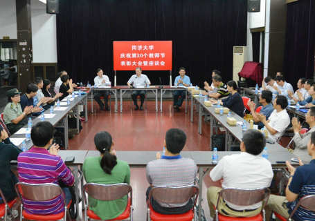 2014年9月19日,学校召开2014年教师节颁奖会暨座谈会。本次座谈会主题为表彰先进教师,倾听教师心声,会议由校党委副书记方守恩主持,校长裴钢,副校长吕培明,首届“追求卓越奖”获得者、“师德师风优秀教师”获得者以及30年教龄教师代表、青年教师代表都出席了本次会议。我院副院长邓慧萍老师作为“2013-2014年度师德师风优秀教师”的获奖者受邀参加本次会议。