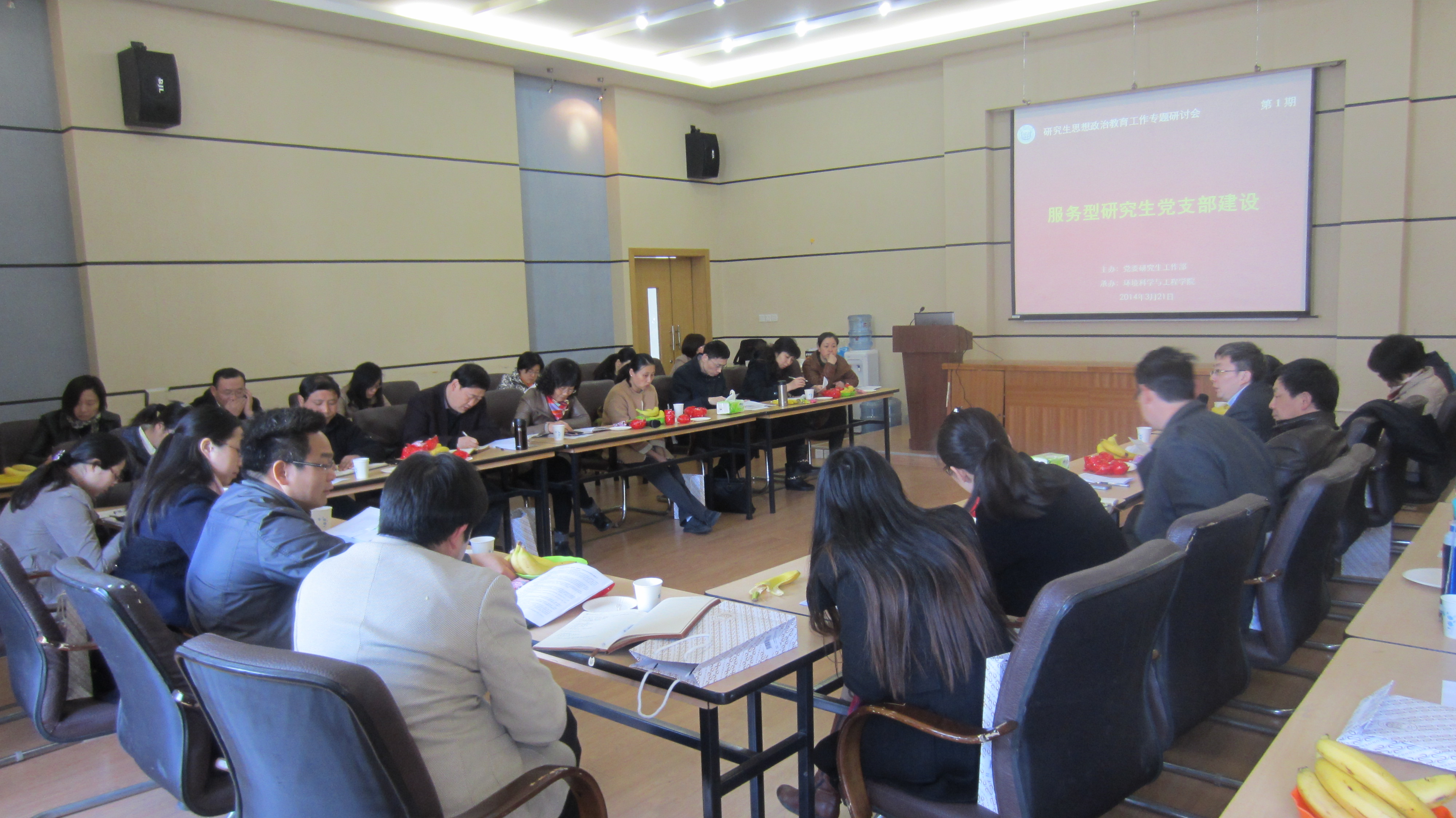 2014年3月22日上午,由校研工部主办、我院承办的第1期研究生思想政治教育工作专题研讨会顺利召开。本次研讨会的主题是“服务型研究生党支部建设”,研工部部长陆居怡、副部长季忠荣、宋木生,及各院系分管学生工作的副书记参加了会议。