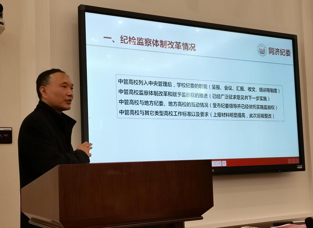 郭老师首先介绍了纪检监察体制改革的总体情况,明确了各位参会人员从事纪检监察工作的重要性,列举了纪检监察工作当中涉及的重要法律法规、党纪党规及习近平总书记听取中央第七轮巡视情况汇报时指出的高校党委工作存在的“六个不足”。接着,郭老师以案促学,评析了近些年高校发生的违规违纪违法案例,并从师生个人角度和单位角度深刻剖析了这些案例产生的根源,为在场纪检委员提供了监督的着力点。最后,结合在职教师、退休教职工、青年学生、新任教师等容易触犯的腐败行为,给纪检委员的工作及其职责针对性地提出几点建议,希望各位纪检委员不仅要在本支部进行党风廉政宣传、警示教育工作,也要将这些工作普及到学院每一位师生。