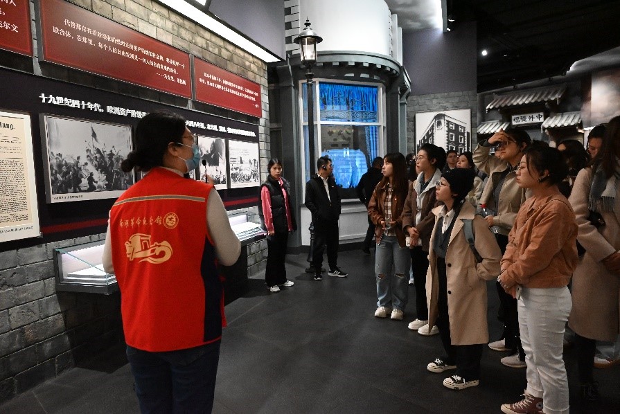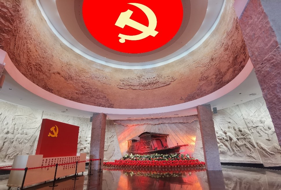 走进南湖红船革命纪念馆序厅,同学们瞻仰着穹顶上的铁锤镰刀,在破墙而出的红船雕塑前,在讲解员的深刻介绍声中,百年党史的宏大画卷在同学们眼前展开。