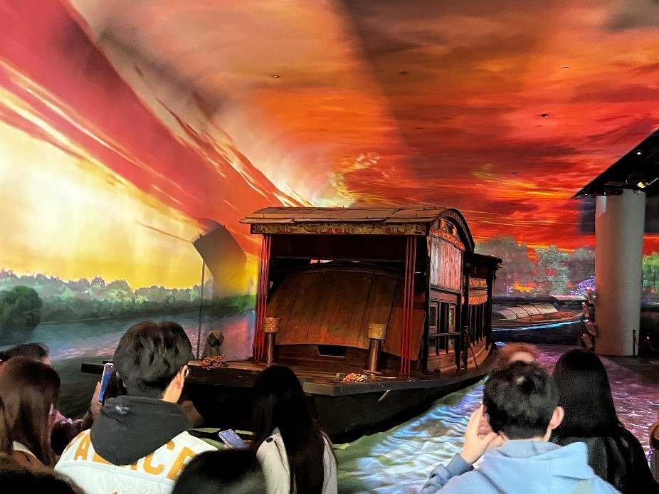 同学们依次步入 “救亡图存”“开天辟地”“光辉历程”“走向复兴”四个展厅。在1:1复制的红船模型前,全息影像技术复原了一大会议时代表们从白天到夜晚开会的情景,让人身临其境,当听到“中国共产党万岁!”的声音从船内传出,看到红色的曙光从天际打向红船,一股莫大的坚定而蓬勃的力量涌上同学们的心头。同学们纷纷感悟,有了崇高的理想和坚定的信念,才能战胜前进道路上的艰难险阻,始终不渝地把社会主义现代化事业推向前进。