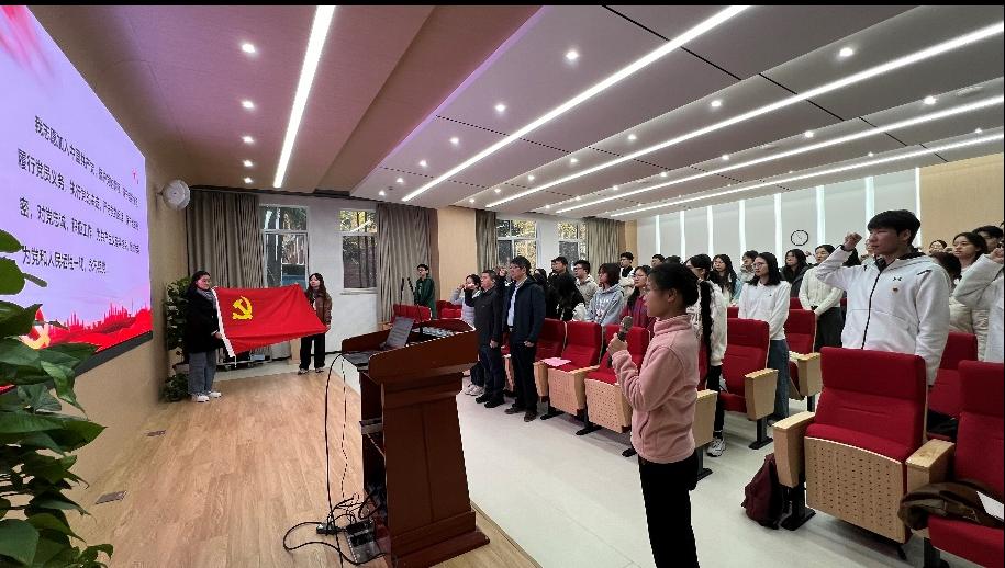 在接下来的预备党员集体宣誓环节中,研究生第四党支部书记刘圆华同志向大家分享了自己的入党心得和感悟,之后在刘圆华同志的带领下,现场全体党员进行了庄严的宣誓。