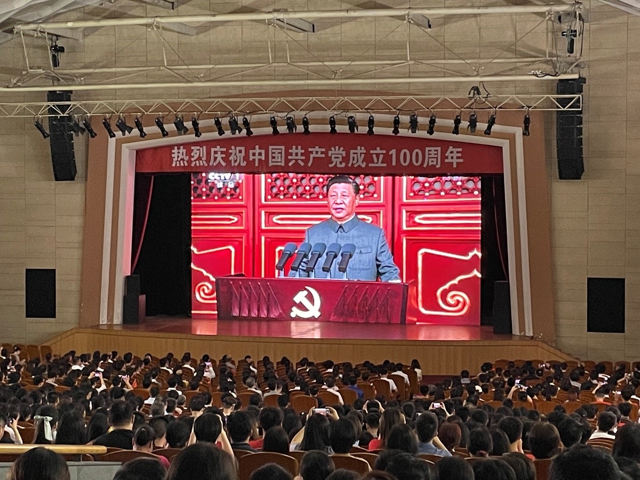 学院师生于四平路大礼堂收看庆祝中国共产党成立100周年大会直播,共同聆听习近平总书记重要讲话
