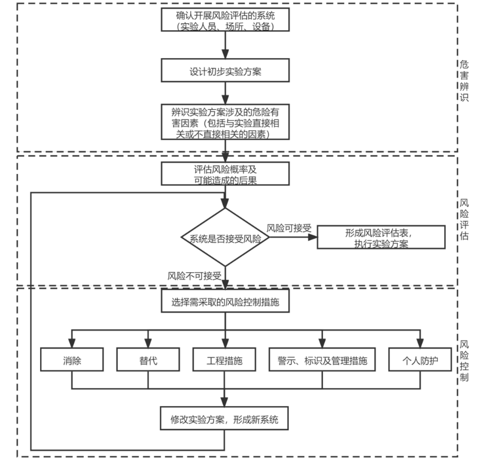 第十一条 各实验室须对所开展的教学科研活动进行风险评估,工作流程参照附件1,实验方案风险评估样表参照附件2。实验室在开展新增实验项目前必须进行风险评估,明确安全隐患和应对措施,开展实验方案风险自评备案试点。在新建、改建、扩建实验室时,应当把安全风险评估作为建设立项的必要条件。