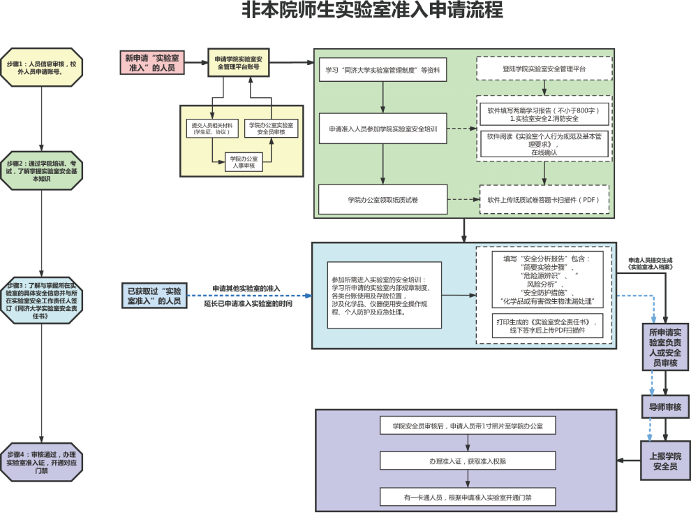 已通过实验室申请准入人员新申请进入其他实验室或延长实验室工作时间,仅须重新完成对应第四、五项工作,并重新提交《实验室准入申请档案》,通过对应审核即可。