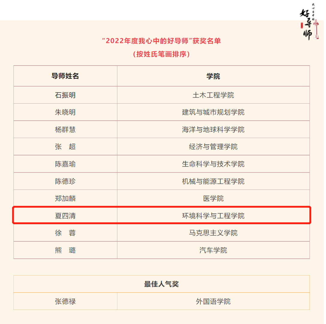 5月14日晚,2022年度bat365官网登录入口研究生导生「枫」采展暨我心目中的好导师专题微视频发布活动在线上如期举行。经过活动前期广泛提名、学院推荐、投票评选及学生评审打分遴选出20位研究生导师进入终评。经过评审,我院夏四清教授在内的10名老师获评“2022年度我心中的好导师”荣誉。